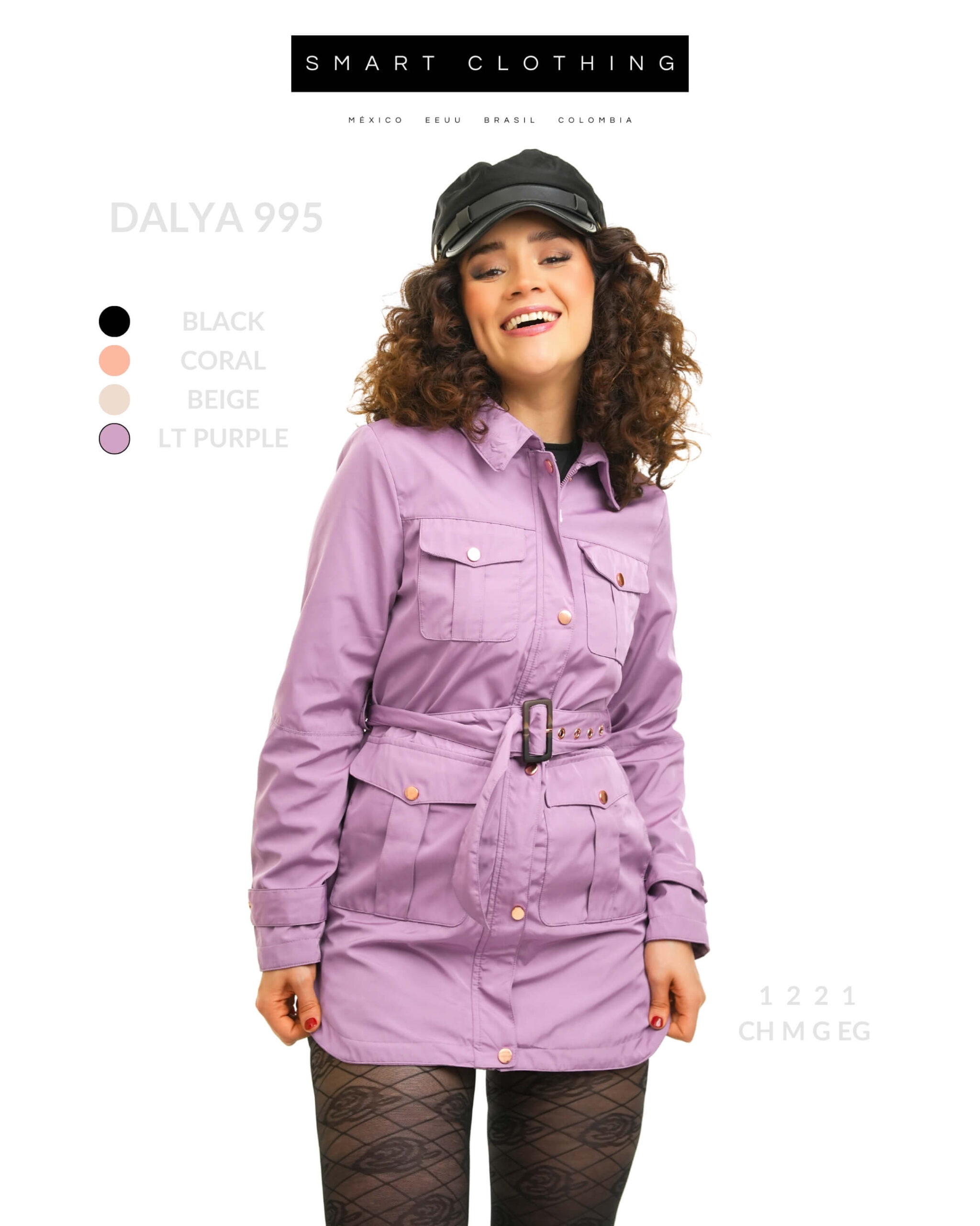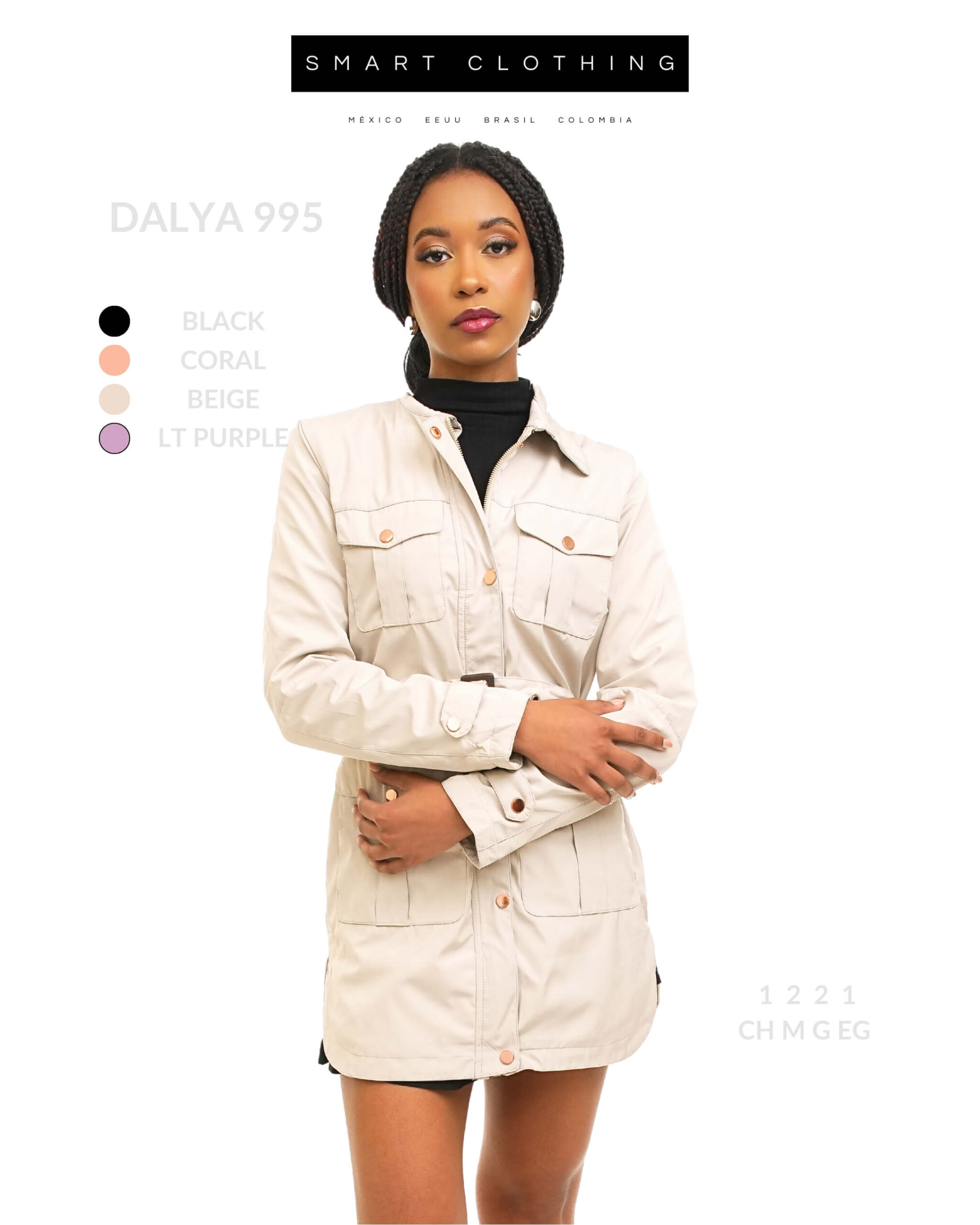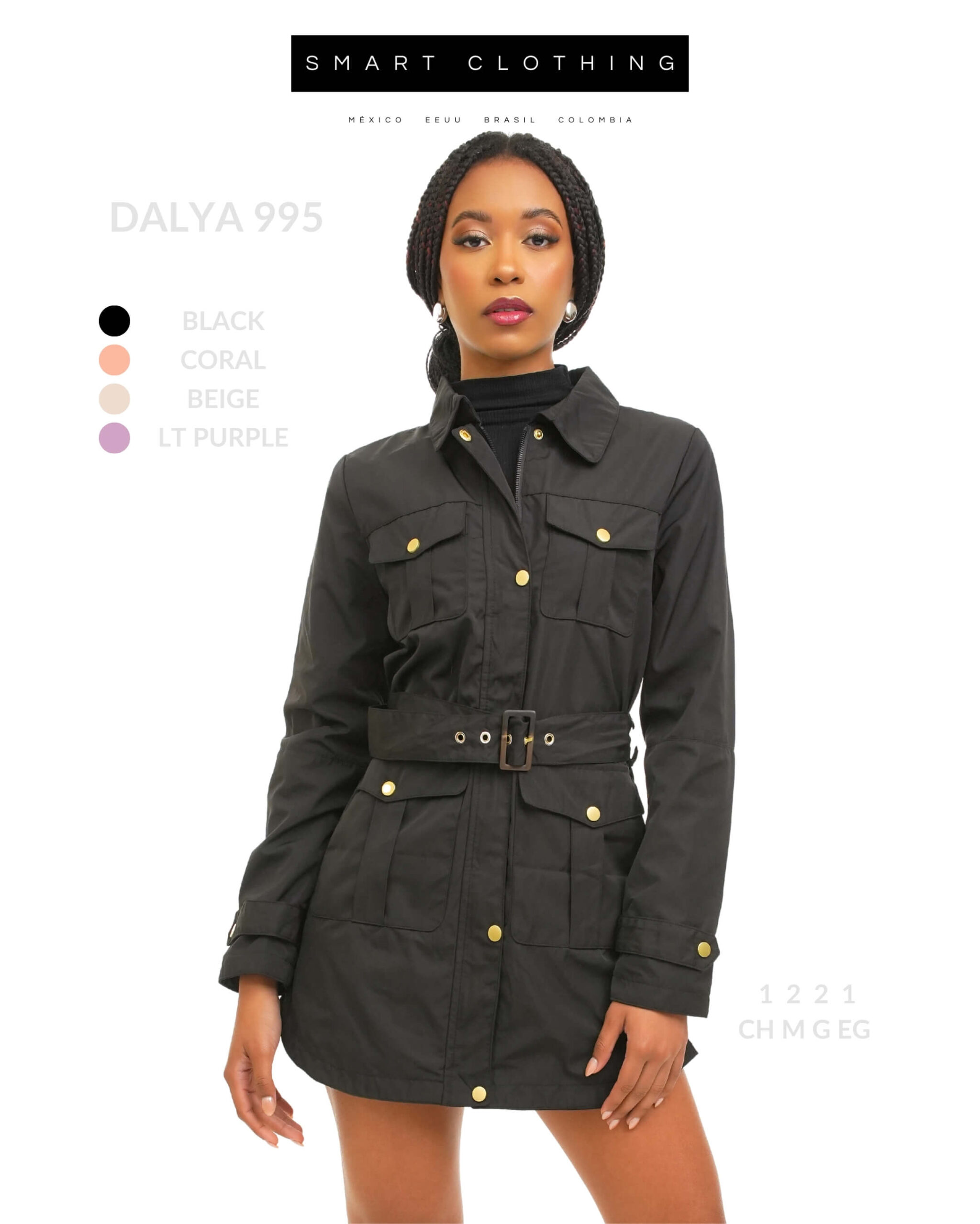 Precio en mayoreo de $240 por prenda. Camisola larga tipo abrigo de poliéster con cuello, cinturón y hebilla plástica, 4 bolsillos con cerradura en botón, aplique decorativo en manga, Diseño elegante y ligero sin relleno.
